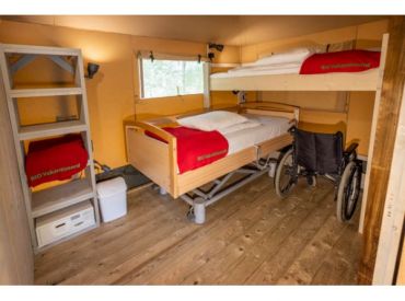 Geniet van het comfort van de glampingtenten van Bio Vakantieoord, ontworpen voor een gezelschap van vijf personen. De accommodatie beschikt over een slaapkamer met een 2-persoonsbed en hoogslaper, en een tweede slaapkamer met een hoog-laagbed en een hoogslaper. De ingerichte keuken is uitgerust met alles wat nodig is voor vijf personen, inclusief een elektrische kookplaat, combi-magnetron en een ruime koelkast. De gelijkvloerse douche met toilet, toiletbeugels, wasbak en douchestoel zorgt voor toegankelijkheid.