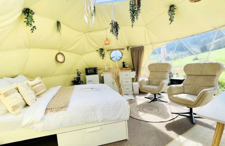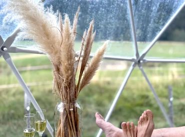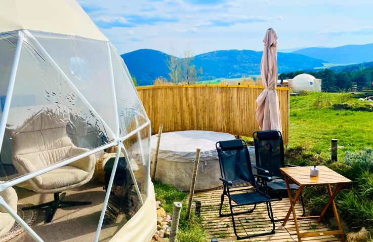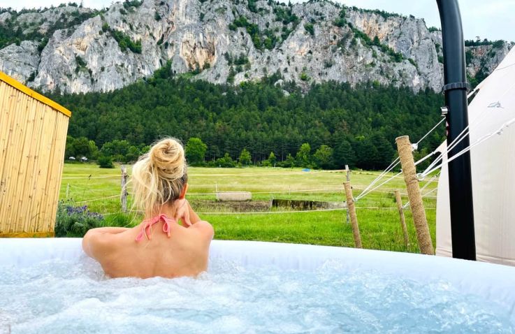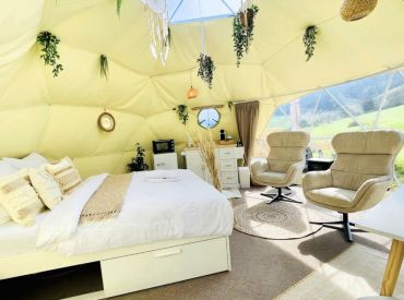 Geniet van ontspannende uren in de gezellige glamping tent, die is uitgerust met liefdevolle details en modern comfort. Ontspan in het privé bubbelbad en geniet van het uitzicht op de fonkelende sterrenhemel door het grote dakraam. Het comfortabele tweepersoonsbed met verwarmde matras zorgt voor behaaglijke warmte, terwijl de airconditioning je koel houdt op warme dagen.