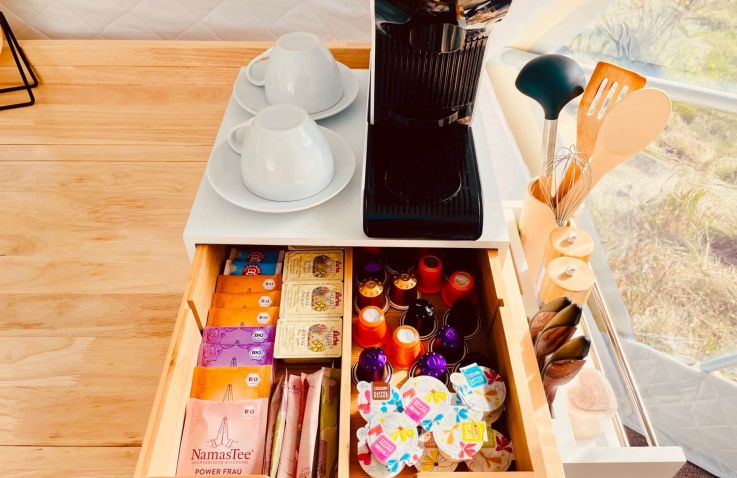 Een stijlvolle elektrische open haard zorgt ook voor een romantische sfeer. Badhanddoeken en slippers zijn aanwezig voor je comfort. In de kleine kitchenette vind je alles wat je nodig hebt voor een ontspannen ontbijt of een snack - inclusief een koelkast, waterkoker, eierkoker, oven en een koffiezetapparaat met koffie- en theefaciliteiten. Er is ook drinkwater in flessen beschikbaar.