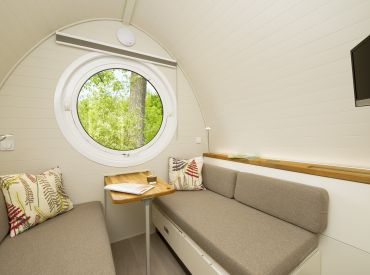 De zithoek met satelliet-tv kan ’s avonds worden omgevormd tot twee eenpersoonsbedden of één tweepersoonsbed. De kleine badkamer is voorzien van een douche, toilet en wastafel. De huisjes beschikken bovendien over airconditioning en vloerverwarming. In de knusse kitchenette vind je een koelkast, koffiezetapparaat, broodrooster, waterkoker, servies, bestek en handige keukengerei.