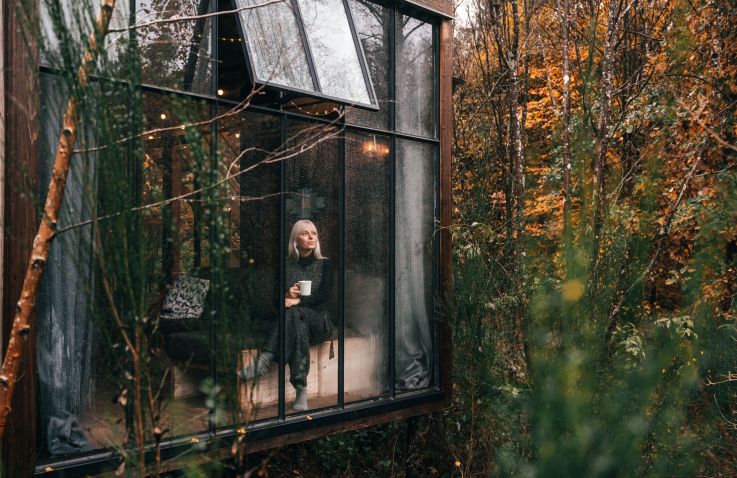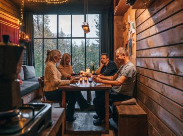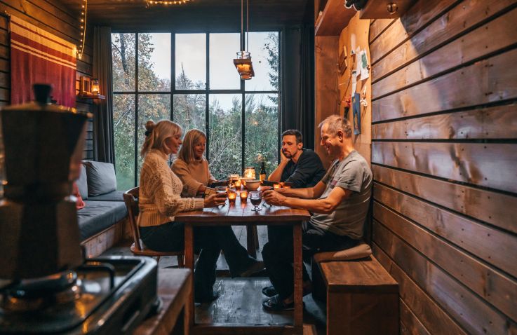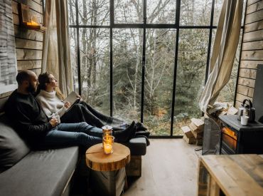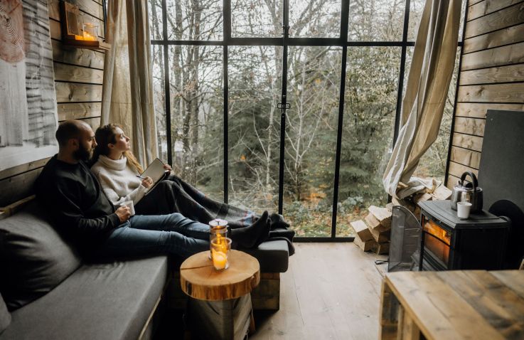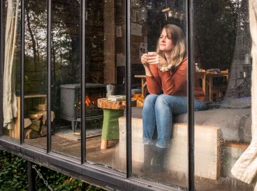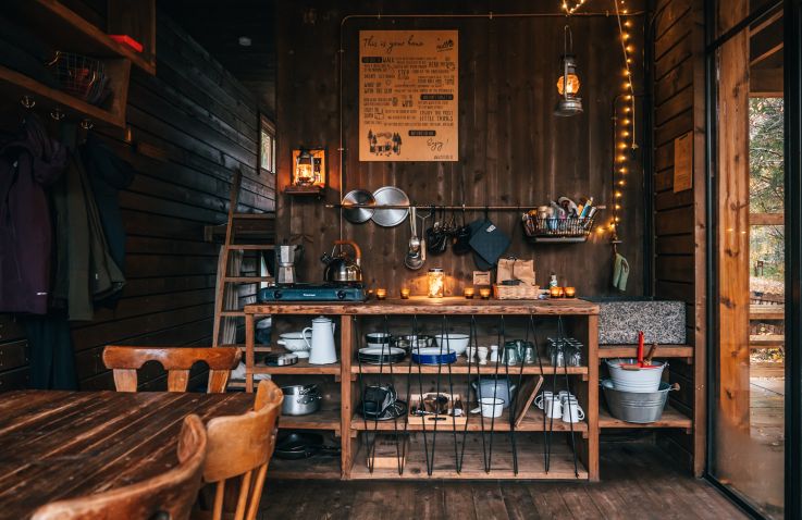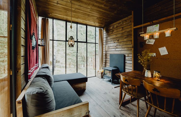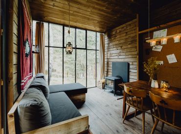 Ook vind je een woonruimte in de lodges. Je kan heerlijk relaxen op een fijne bank en er is een aparte zithoek met een mooie houten tafel en stoelen. Er is een houtkachel aanwezig om de lodge op te warmen. Enkele lodges hebben een terras in een torentje. Er is zelfs een lodge die een hottub heeft! Door de grote stalen ramen wordt de natuur naar binnen gezogen. De charme van de houtkachel, olielampen en kaarsen geven de lodge veel sfeer en gezelligheid.