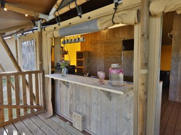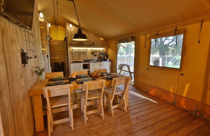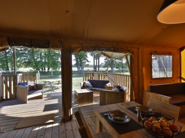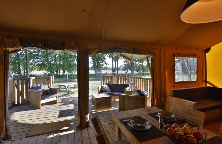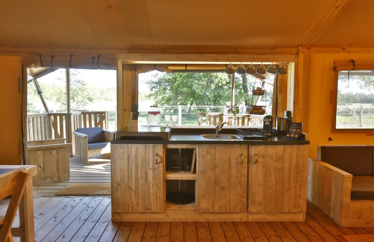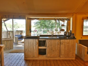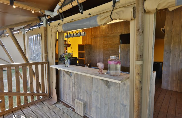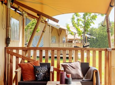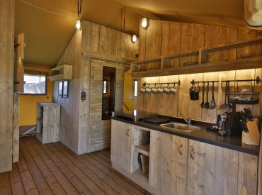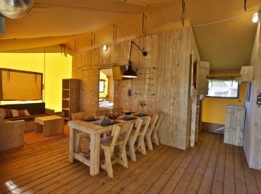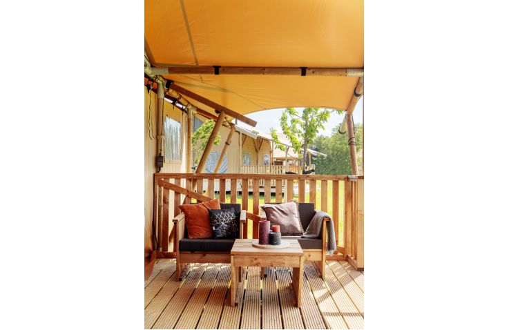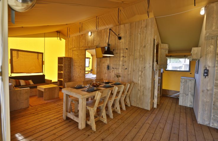 Tent Lodge I biedt 65 m² ruimte voor maximaal zes volwassenen en is daarmee ideaal voor grotere gezinnen of vriendengroepen. Drie aparte slaapkamers zorgen voor maximale privacy: een ouderslaapkamer met een comfortabel kingsize bed en nog twee slaapkamers met elk twee eenpersoonsbedden. Het overdekte terras van 15 m² nodigt je uit om te ontspannen, of je nu ontbijt met uitzicht op zee of 's avonds gezellig samenkomt, beschermd tegen weer en wind.