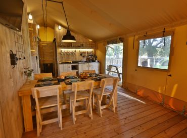 Achter het eenvoudige ontwerp van de tenten gaat binnenin veel luxe schuil. Een chique, goed uitgeruste keuken met elektrisch fornuis, een eethoek, een gezellige woonkamer met flatscreentelevisie en aparte slaapkamers met comfortabele bedden en een eigen badkamer met douche en toilet maken je verblijf tot iets bijzonders. De behoefte aan openheid is typisch Scandinavisch: de voorwanden van de tenten kunnen worden opgerold, waardoor een naadloze overgang tussen binnen en buiten ontstaat. Elke tentlodge is inclusief gratis wifi, beddengoed en handdoeken, haardroger, kluisje, een bolderkar voor het vervoeren van je bagage, een kachel (olie tegen betaling), je persoonlijke gereserveerde parkeerplaats en een eerste voorraad toiletpapier, koffiecapsules en vuilniszakken.