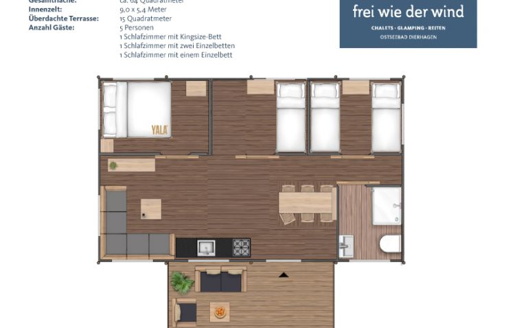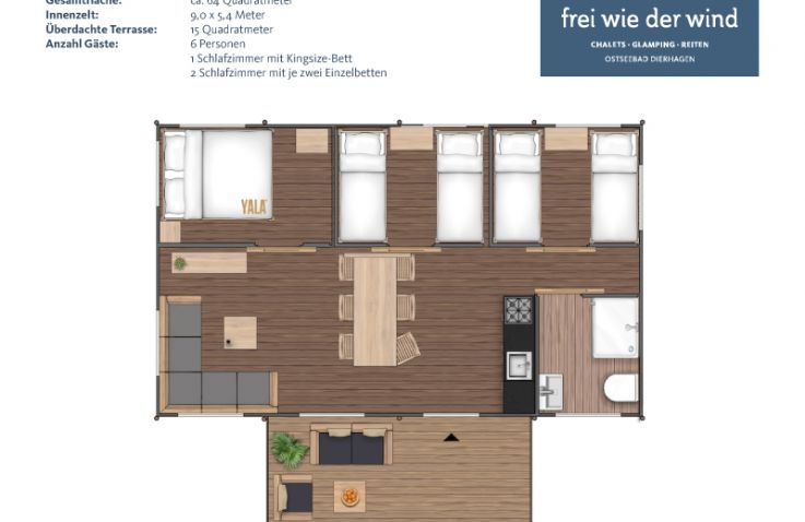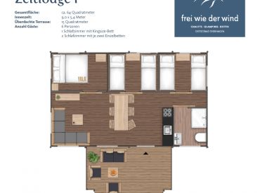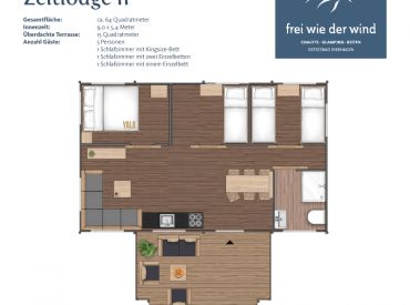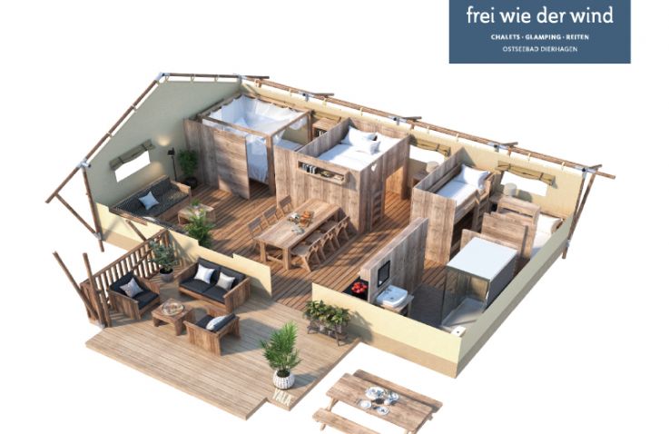 Met zijn 65 m² is de Tent Lodge II perfect voor gezinnen of kleine groepen van maximaal vijf volwassenen. De flexibele kamerindeling met drie slaapkamers maakt individuele slaapindelingen mogelijk: een grote slaapkamer met een kingsize bed, een kamer met twee eenpersoonsbedden en een extra kamer met een eenpersoonsbed. Ook hier kun je genieten van een ruim overdekt terras van 15 m² als verlengde buitenruimte waar je volop kunt genieten van de Baltische zeelucht.